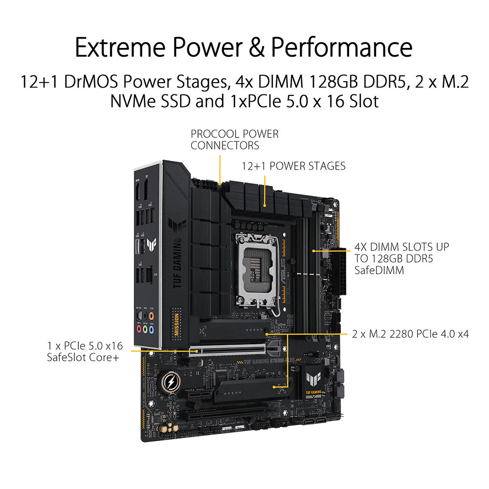 • The ASUS B760M-PLUS motherboard is PCIe 5.0 Ready supporting up to 128GB DDR5 7200+MHz (OC) of memory and Intel Turbo Boost Technology. The DDR5 ASUS motherboard support next gen PCIe 5.0 M.2 slots making it future proof.