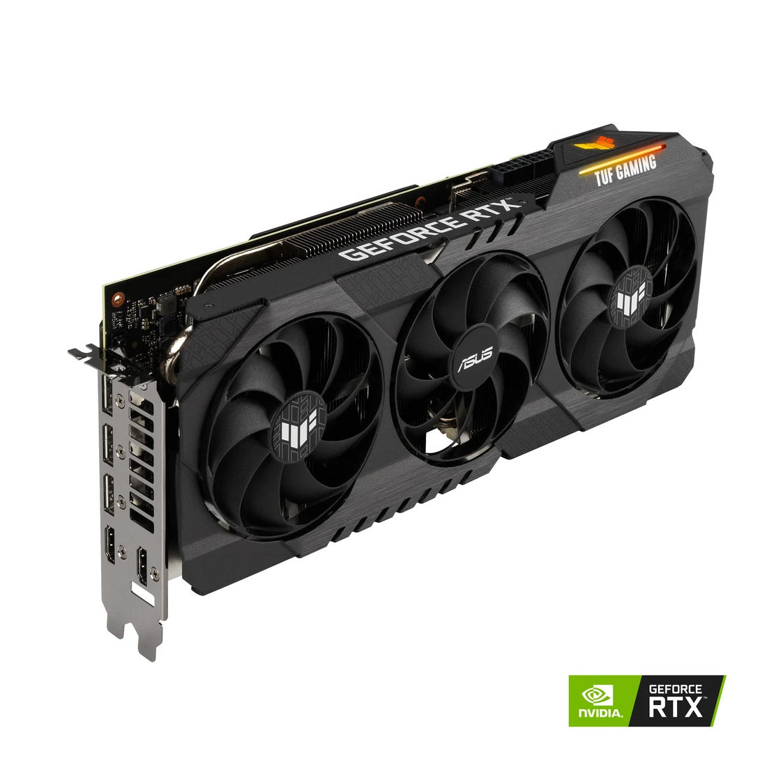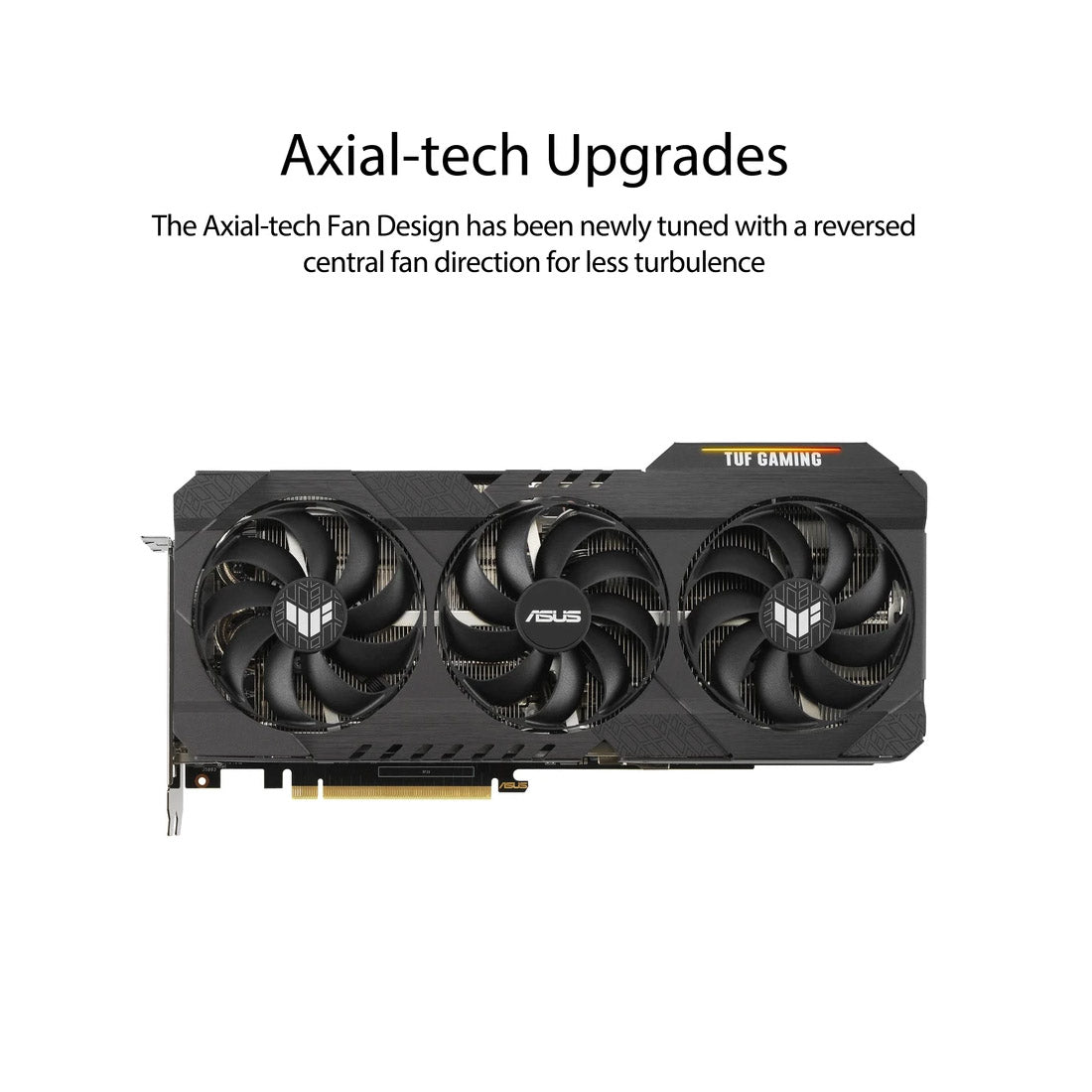 The TUF Gaming GeForce RTX 3060 Ti OC Edition has been stripped down and built back up to provide more robust power and cooling. A new all-metal shroud houses three powerful axial-tech fans that utilize durable dual ball fan bearings. Fan rotation has been optimized for reduced turbulence, and a stop mode brings all three fans to a halt at low temps.