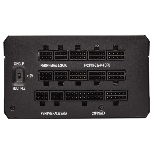 Toggle single +12V rail or multi +12V rail mode. In the “SINGLE” position, the full output capability of the power supply’s +12V rail is available to any and all connectors, while in the “MULTIPLE” position, each individual connector has Over-Current Protection so no more than 40A of current can be delivered on any given cable.