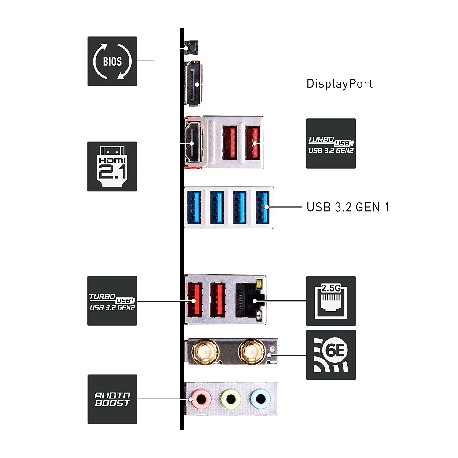 | Back Panel I/O Ports | 2x USB 3.2 Gen 2 10Gbps (Type-A) 4x USB 3.2 Gen 1 5Gbps (Type-A) 1x 2.5G LAN 2x Wi-Fi / Bluetooth 1x Audio connectors 1x Flash BIOS Button 1x DisplayPort 1x HDMI 2x USB 3.2 Gen 2 10Gbps (Type-A) |